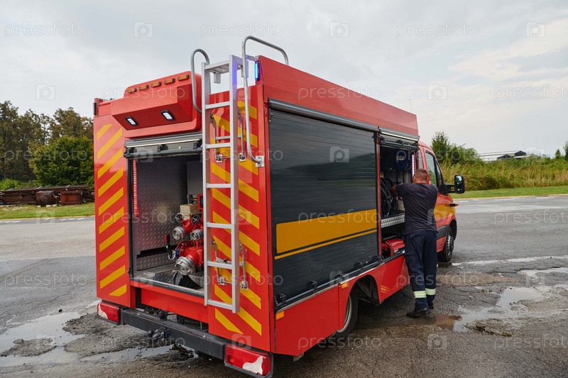 Современная пожарная машина, оснащенная передовыми спасательными технологиями, вместе со своей квалифицированной пожарной командой готова вмешаться и быстро отреагировать на чрезвычайные ситуации, обеспечивая безопасность и защиту населения