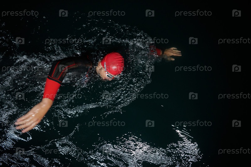 Решительный профессиональный триатлонист проходит тщательную ночную тренировку в холодной воде, демонстрируя преданность делу и стойкость в подготовке к предстоящим соревнованиям по триатлону по плаванию