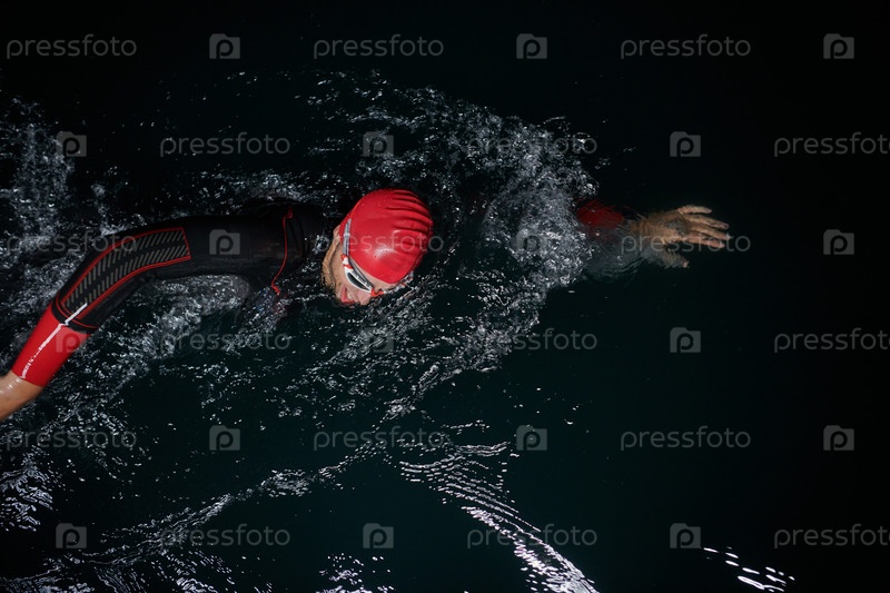 Решительный профессиональный триатлонист проходит тщательную ночную тренировку в холодной воде, демонстрируя преданность делу и стойкость в подготовке к предстоящим соревнованиям по триатлону по плаванию