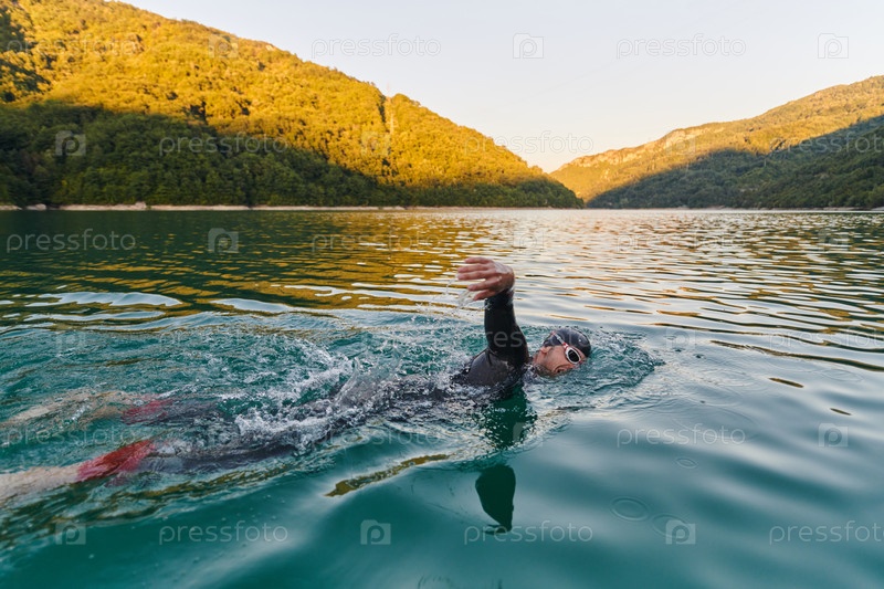 Спортсмен по триатлону плавает на озере на рассвете в гидрокостюме