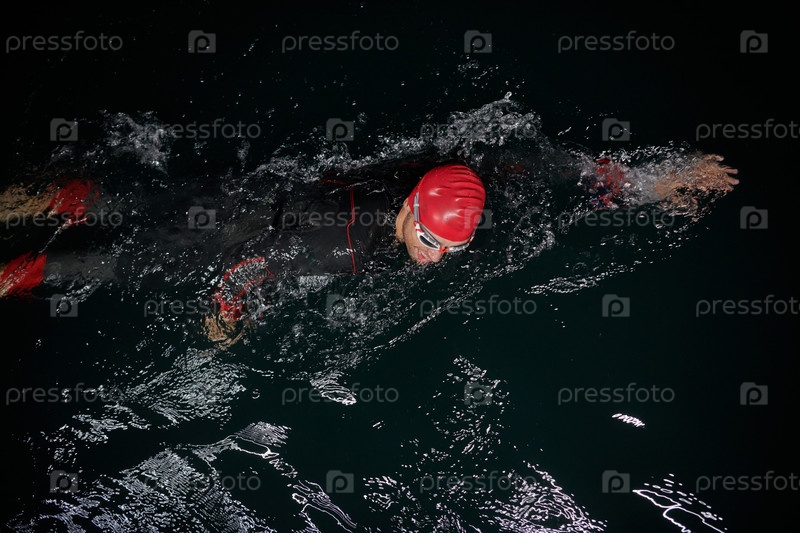 Решительный профессиональный триатлонист проходит тщательную ночную тренировку в холодной воде, демонстрируя преданность делу и стойкость в подготовке к предстоящим соревнованиям по триатлону по плаванию