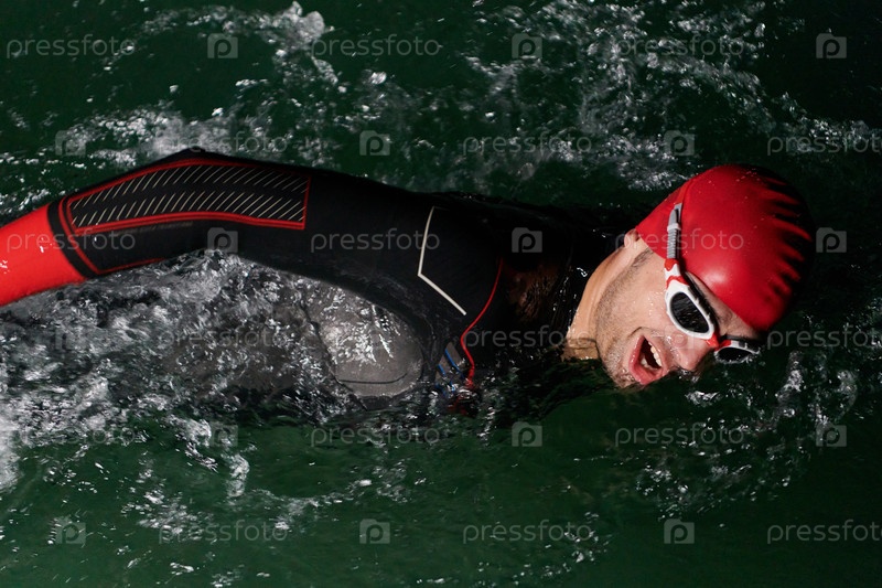 Решительный профессиональный триатлонист проходит тщательную ночную тренировку в холодной воде, демонстрируя преданность делу и стойкость в подготовке к предстоящим соревнованиям по триатлону по плаванию