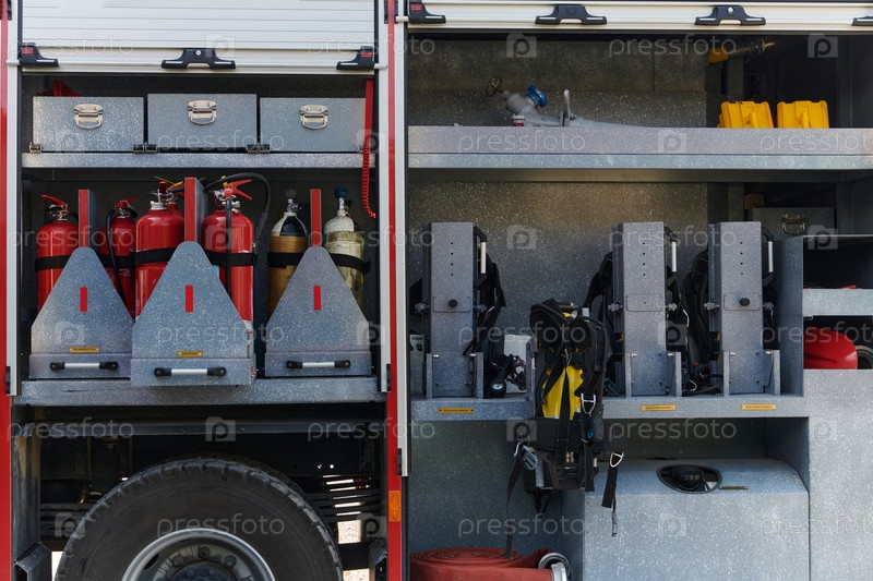 Крупный план основного противопожарного оборудования на современной пожарной машине, демонстрация инструментов и снаряжения, готовых к экстренному реагированию на опасные пожарные ситуации