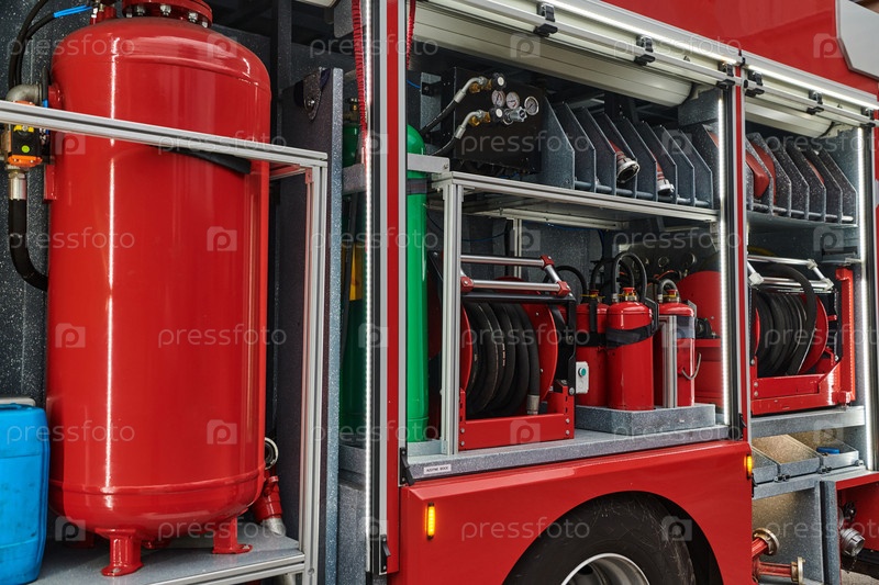 Крупный план основного противопожарного оборудования на современной пожарной машине, демонстрация инструментов и снаряжения, готовых к экстренному реагированию на опасные пожарные ситуации