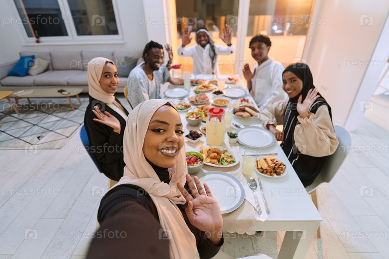 Традиционная мусульманская семья запечатлела радость совместной трапезы ифтар во время священного месяца Рамадан с помощью веселого семейного селфи, сочетающего культурное богатство, семейную близость и дух праздника в одном снимке