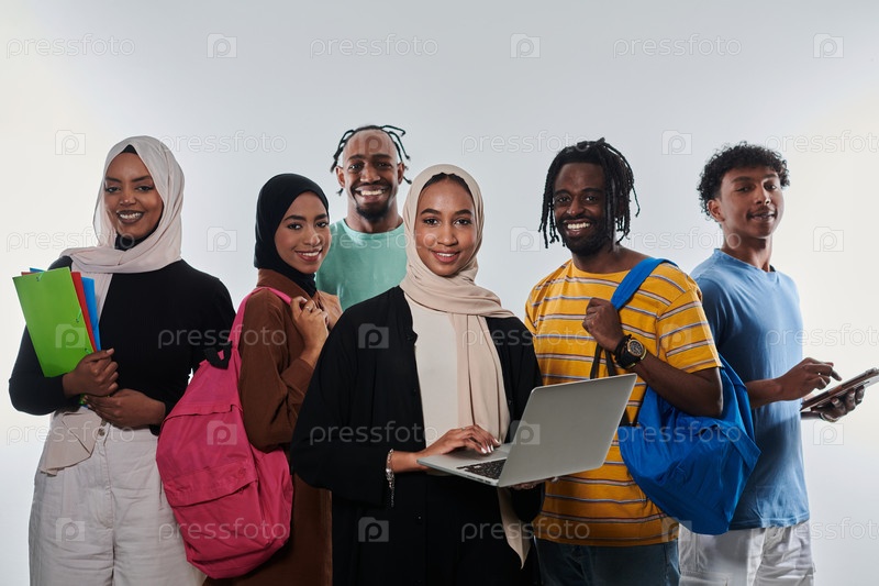 Группа разнообразных студентов занимается современными образовательными практиками, используя различные технологические инструменты, такие как ноутбуки, планшеты и смартфоны, на чистом белом фоне, иллюстрируя современный подход к совместному обучению и до