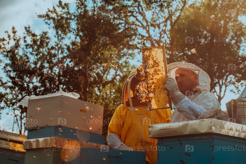 Пчеловоды проверяют мед на рамке улья в поле. Владельцы малого бизнеса на пасеке. Производитель натуральных здоровых продуктов питания работает с пчелами и ульями на пасеке