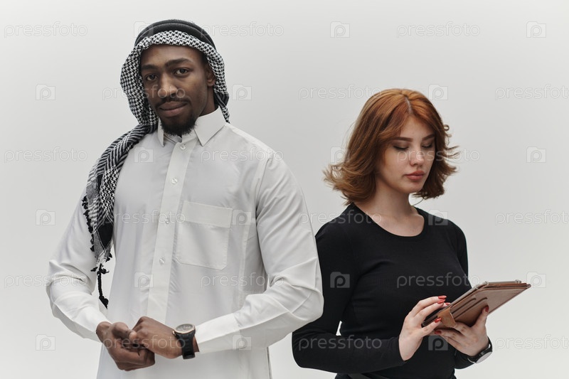 Арабский предприниматель и деловая женщина, излучающие уверенность и единство, позируют вместе на чистом белом фоне, символизируя динамичное партнерство, характеризующееся амбициями, инновациями и совместным успехом в сфере бизнеса