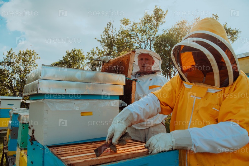 Пчеловоды проверяют мед на рамке улья в поле. Владельцы малого бизнеса на пасеке. Производитель натуральных здоровых продуктов питания работает с пчелами и ульями на пасеке