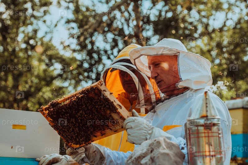 Пчеловоды проверяют мед на рамке улья в поле. Владельцы малого бизнеса на пасеке. Производитель натуральных здоровых продуктов питания работает с пчелами и ульями на пасеке