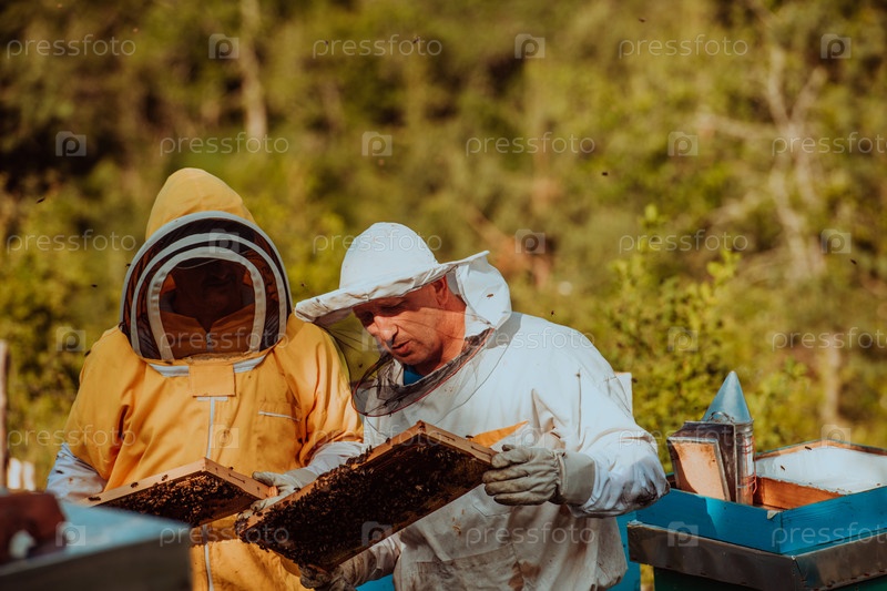 Пчеловоды проверяют мед на рамке улья в поле. Владельцы малого бизнеса на пасеке. Производитель натуральных здоровых продуктов питания работает с пчелами и ульями на пасеке