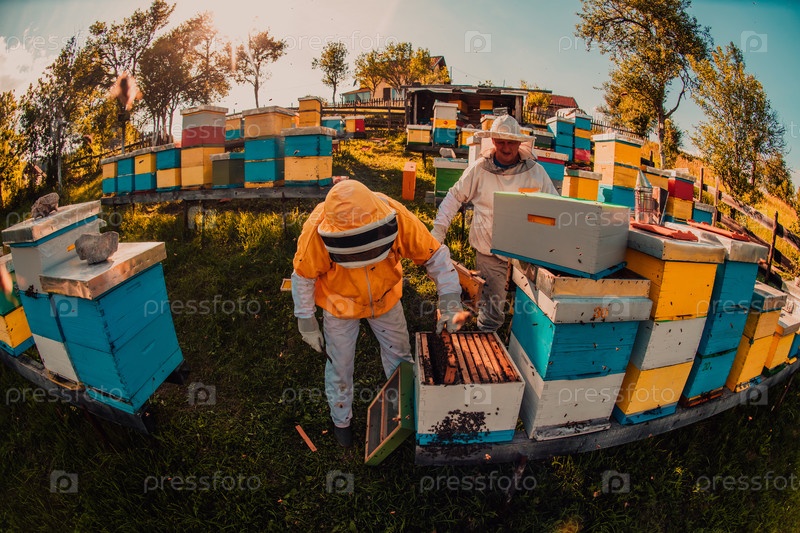 Пчеловоды проверяют мед на рамке улья в поле. Владельцы малого бизнеса на пасеке. Производитель натуральных здоровых продуктов питания работает с пчелами и ульями на пасеке