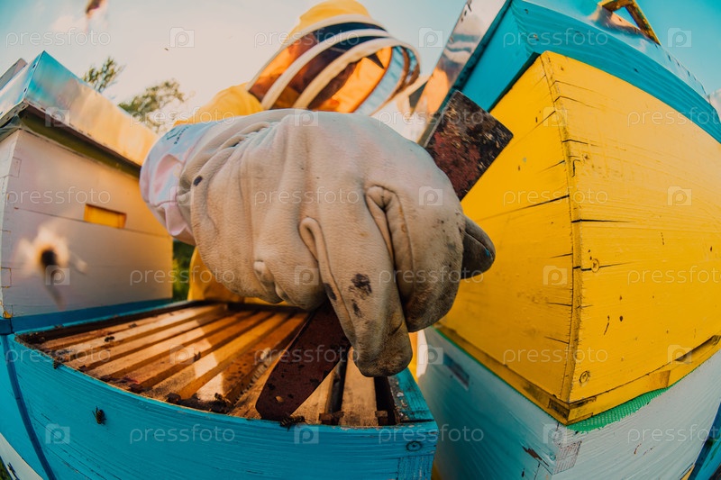 Пчеловод проверяет мед на рамке улья в поле. Владелец малого бизнеса на пасеке. Производитель натуральных здоровых продуктов питания работает с пчелами и ульями на пасеке