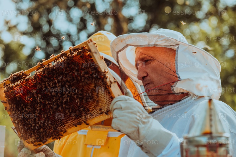 Пчеловоды проверяют мед на рамке улья в поле. Владельцы малого бизнеса на пасеке. Производитель натуральных здоровых продуктов питания работает с пчелами и ульями на пасеке