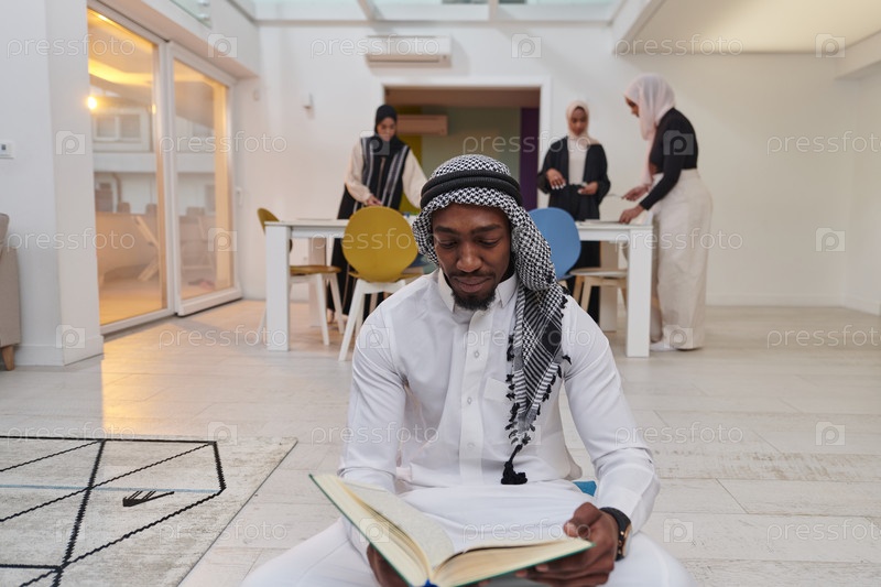 В священный месяц Рамадан афроамериканец-мусульманин, поглощенный чтением Священного Корана, окружен фоном, на котором три женщины в хиджабе готовят и подают еду для ифтара, изображая сцену духовной преданности, культурного единства и общественного праздн