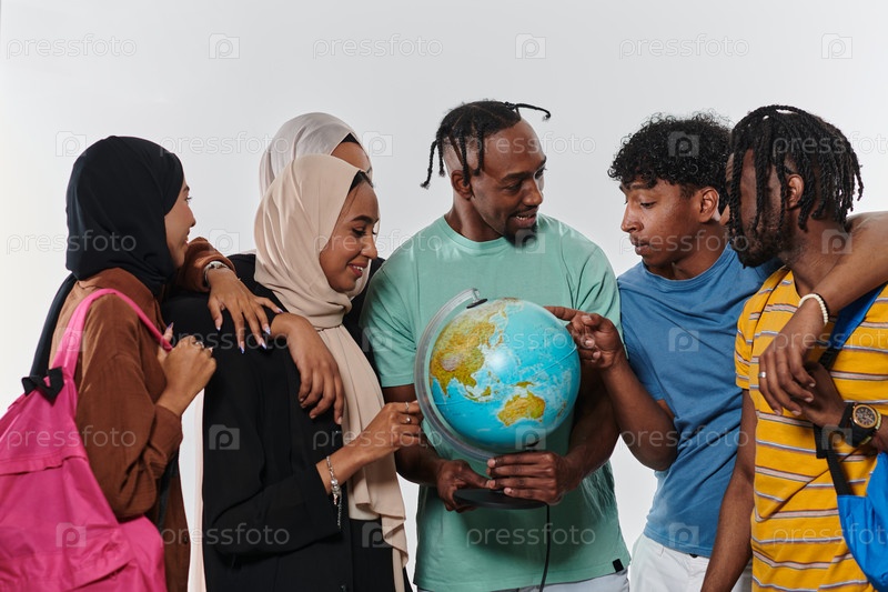 Разнообразная группа студентов собралась по всему миру, поглощенная исследованием и обучением, их яркая энергия запечатлена на первозданном белом фоне, символизируя единство и любопытство в их образовательном путешествии
