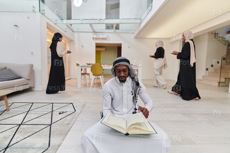 В священный месяц Рамадан афроамериканец-мусульманин, поглощенный чтением Священного Корана, окружен фоном, на котором три женщины в хиджабе готовят и подают еду для ифтара, изображая сцену духовной преданности, культурного единства и общественного праздн