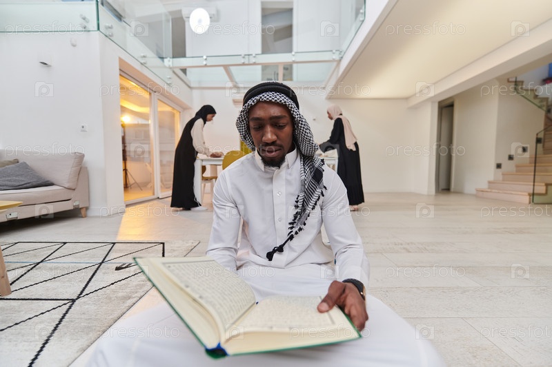 В священный месяц Рамадан афроамериканец-мусульманин, поглощенный чтением Священного Корана, окружен фоном, на котором три женщины в хиджабе готовят и подают еду для ифтара, изображая сцену духовной преданности, культурного единства и общественного праздн