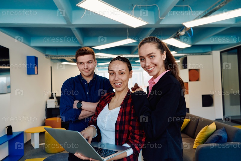 Молодая команда бизнес-профессионалов позирует для портрета офиса стартапа, излучая уверенность и амбиции, при этом одна женщина держит ноутбук, что символизирует инновации и сотрудничество в предпринимательстве
