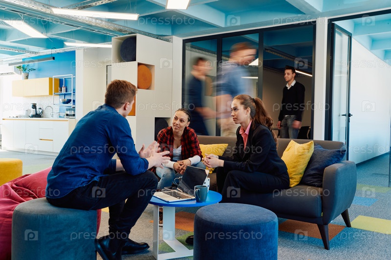 Многонациональная стартап-бизнес-команда встречается в современном ярком коворкинг-офисе под открытым небом. Мозговой штурм, работа на ноутбуке. Группа коллег ходит в размытом состоянии