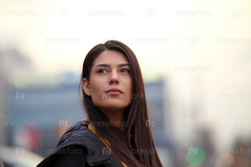Красивая женщина позирует для портрета в городской обстановке, излучая уверенность и элегантность среди суетливой городской среды