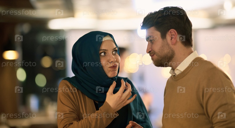 Исламская европейская пара разделяет смех и радость, наслаждаясь вкусной выпечкой во время ифтара в священный месяц Рамадан, олицетворяя радость, культурный праздник и кулинарное наслаждение