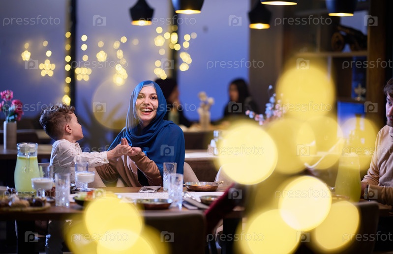 В современном ресторане исламская пара и их дети с радостью ждут ифтара во время священного месяца Рамадан, олицетворяя семейную гармонию и культурный праздник в современной обеденной атмосфере