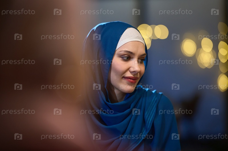 В современном ресторане красивая европейская мусульманка изящно наслаждается атмосферой и кулинарными изысками во время священного месяца Рамадан, воплощая элегантность и духовное спокойствие среди культурного праздника