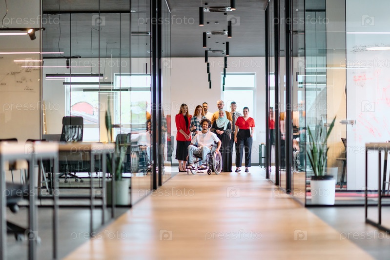 Разнообразная группа молодых бизнесменов, идущих по коридору в застекленном офисе современного стартапа, включая человека в инвалидной коляске и женщину в хиджабе