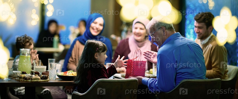 Бабушки и дедушки приходят на встречу своих детей и внуков на ифтар в ресторане во время священного месяца Рамадан, неся подарки и делясь заветными моментами любви, единения и культурного обмена, с нетерпением ожидая совместной трапезы