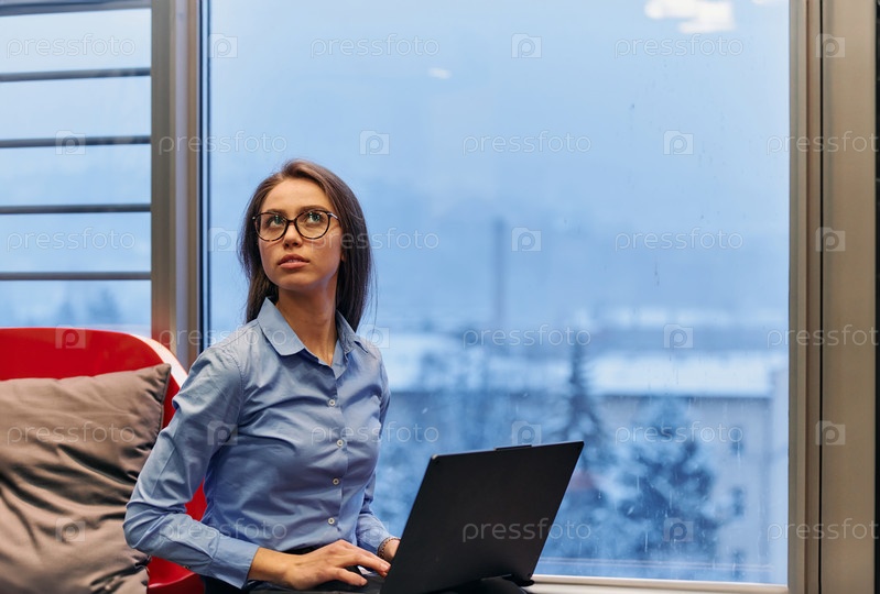 Деловая женщина использует свой ноутбук, сидя у окна большого корпоративного здания, на фоне которого открывается живописный вид на городской пейзаж