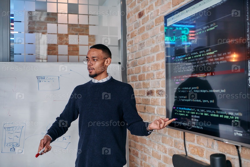 Афроамериканский бизнесмен убедительно презентует свою бизнес-стратегию своим коллегам, способствуя сотрудничеству и дальновидному мышлению