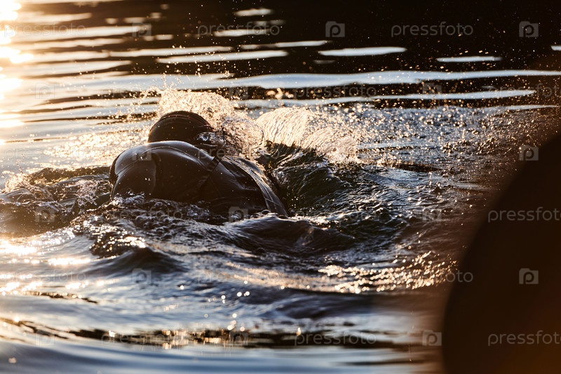 Спортсмен по триатлону плавает на озере на рассвете в гидрокостюме