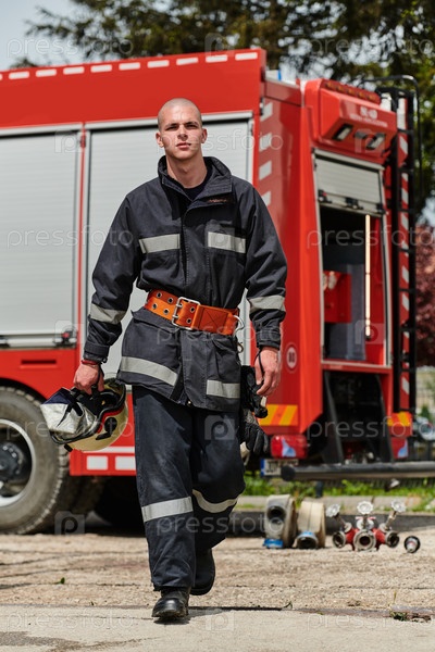 Пожарный гордо стоит с профессиональным снаряжением рядом с пожарной машиной после интенсивной тренировки