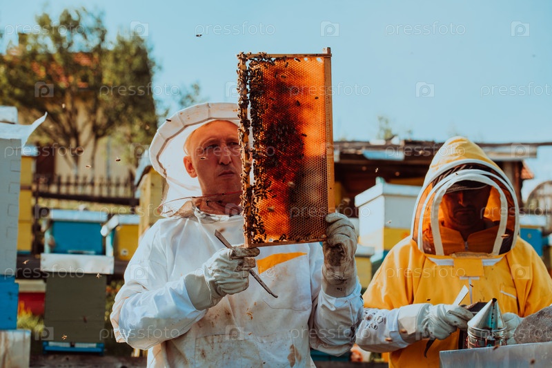 Пчеловоды проверяют мед на рамке улья в поле. Владельцы малого бизнеса на пасеке. Производитель натуральных здоровых продуктов питания работает с пчелами и ульями на пасеке