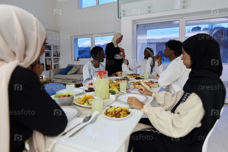 В священный месяц Рамадан мусульманская семья радостно собирается за столом, с нетерпением ожидая общего ифтара, участвуя в приготовлении общей трапезы и объединяясь в ожидании коллективной молитвы, воплощая дух единения, преданности и культурный праздник