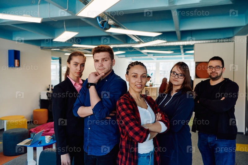 Портрет успешного творческого бизнесмена и деловой женщины, смотрящей в камеру и улыбающейся. Разнообразные деловые люди стоят вместе при запуске