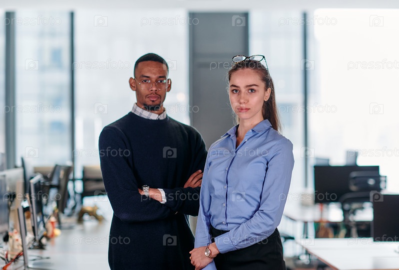 Динамичное деловое сотрудничество: блондинка-бизнесмен и афроамериканская коллега в современном офисе