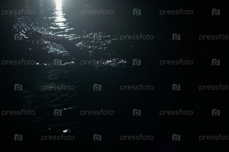Решительный профессиональный триатлонист проходит тщательную ночную тренировку в холодной воде, демонстрируя преданность делу и стойкость в подготовке к предстоящим соревнованиям по триатлону по плаванию