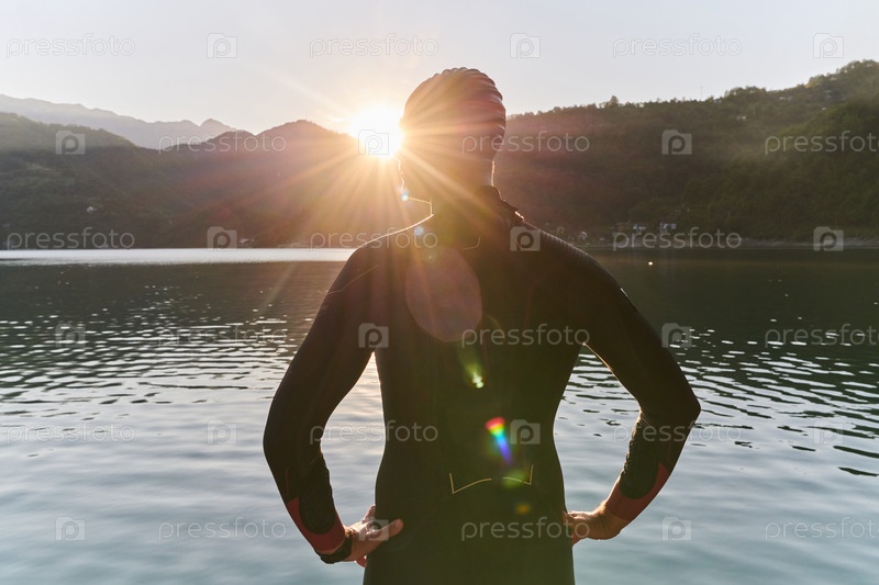 Настоящий спортсмен по триатлону готовится к тренировке по плаванию на озере