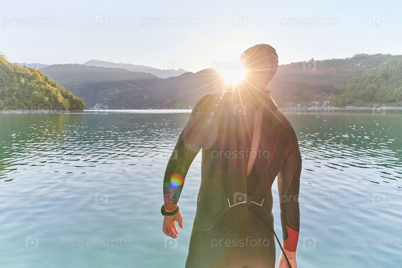 Настоящий спортсмен по триатлону готовится к тренировке по плаванию на озере
