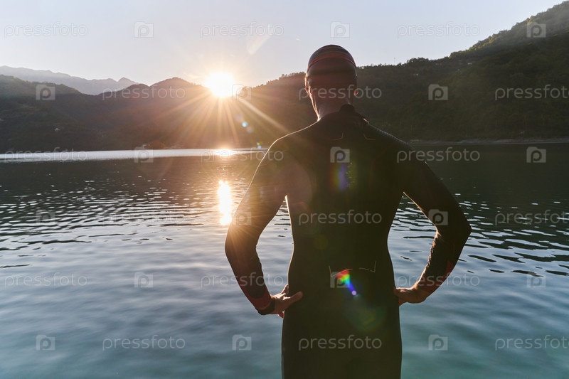 Настоящий спортсмен по триатлону готовится к тренировке по плаванию на озере