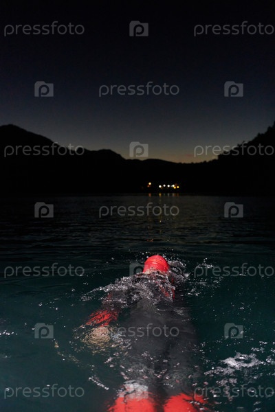 Решительный профессиональный триатлонист проходит тщательную ночную тренировку в холодной воде, демонстрируя преданность делу и стойкость в подготовке к предстоящим соревнованиям по триатлону по плаванию