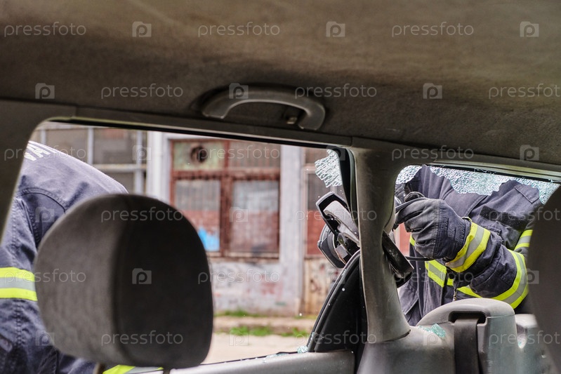 Специальная команда профессиональных пожарных использует специальные инструменты для разрезания и разрушения обломков транспортных средств, демонстрируя свое умелое сотрудничество и быстрое реагирование при спасении людей, попавших в автомобильную аварию