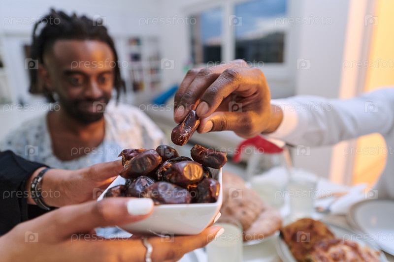 На пронзительном крупном плане разные руки мусульманской семьи деликатно сжимают свежие финики, символизируя прекращение поста во время священного месяца Рамадан, запечатлевая момент культурного единства, общих традиций и радостного ожидания общего ифтара