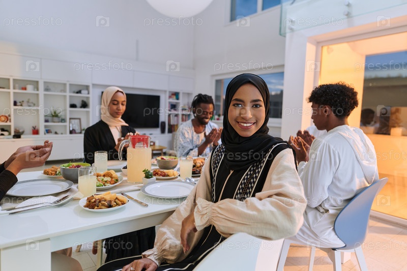 В священный месяц Рамадан разнообразная мусульманская семья объединяется в духовном единстве, горячо молясь Богу перед разговением, фиксируя момент коллективной преданности, культурного разнообразия и семейной радости посреди священного праздника