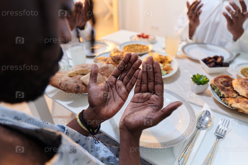 В священный месяц Рамадан разнообразная мусульманская семья объединяется в духовном единстве, горячо молясь Богу перед разговением, фиксируя момент коллективной преданности, культурного разнообразия и семейной радости посреди священного праздника
