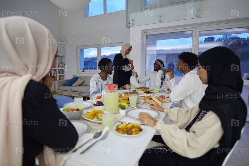 В священный месяц Рамадан мусульманская семья радостно собирается за столом, с нетерпением ожидая общего ифтара, занимаясь приготовлением общей трапезы и объединяясь в ожидании коллективной молитвы, воплощая дух единения, преданности и культурный праздник