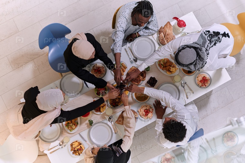 Вид сверху: разные руки мусульманской семьи деликатно сжимают свежие финики, символизируя прекращение поста во время священного месяца Рамадан, запечатлевая момент культурного единства, общих традиций и радостного ожидания общего ифтара