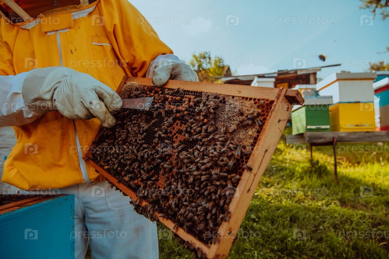 Пчеловод проверяет мед на рамке улья в поле. Владелец малого бизнеса на пасеке. Производитель натуральных здоровых продуктов питания работает с пчелами и ульями на пасеке